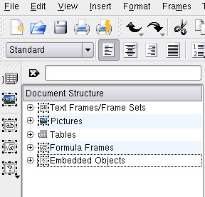KWord позволяет использовать панель структуры документа, чтобы быстро перейти к определённой текстовой врезке, к рисунку или просто проверить структуру документа.