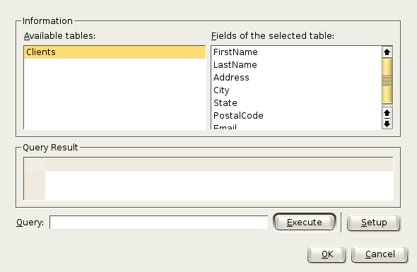 Строка запроса расположена внизу диалога и называется Запрос. Введите SQL-запрос в это поле и нажмите . KWord выполнит запрос к базе данных и покажет результаты запроса в виде таблицы в поле Результат запроса. Вы можете изменить или отредактировать запрос в строке запроса, и каждый раз после нажатия кнопки будет появляться новый результат.