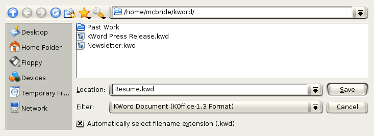 Выбрав команду , вы говорите KWord сохранить файл с его текущим именем. Вы не сможете изменить имя файла или его расположение. Если вы хотите изменить его название или место расположение, вы должны выбрать -> из меню.