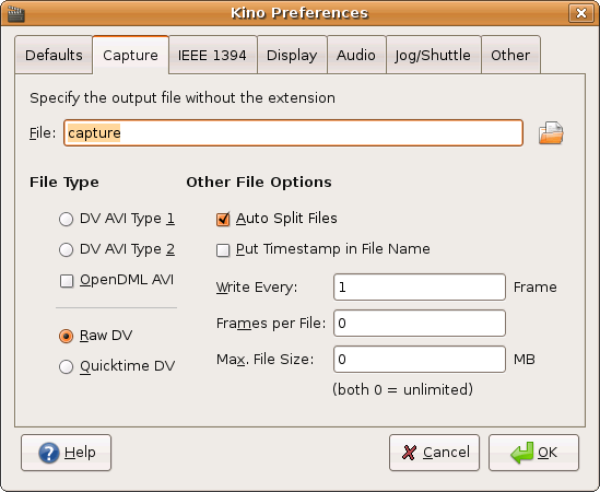 This page of the Preferences dialog contains the settings for the capture mode ( Chapter 6, Capturing DV ).