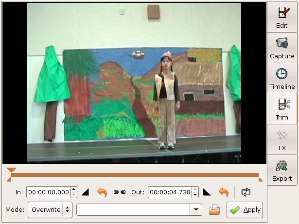 Trim is a powerful editing tool. At its very basic usage, one can use it to fine-tune the scenes created using the basic editing techniques offered in the edit page ( Chapter 7, How to Edit with Kino ). Alternatively, use the trim page for a more advanced editing style called "3 point insert" editing. The key facets of the trim page are the In and Out points, the Storyboard view, and the trim Mode .